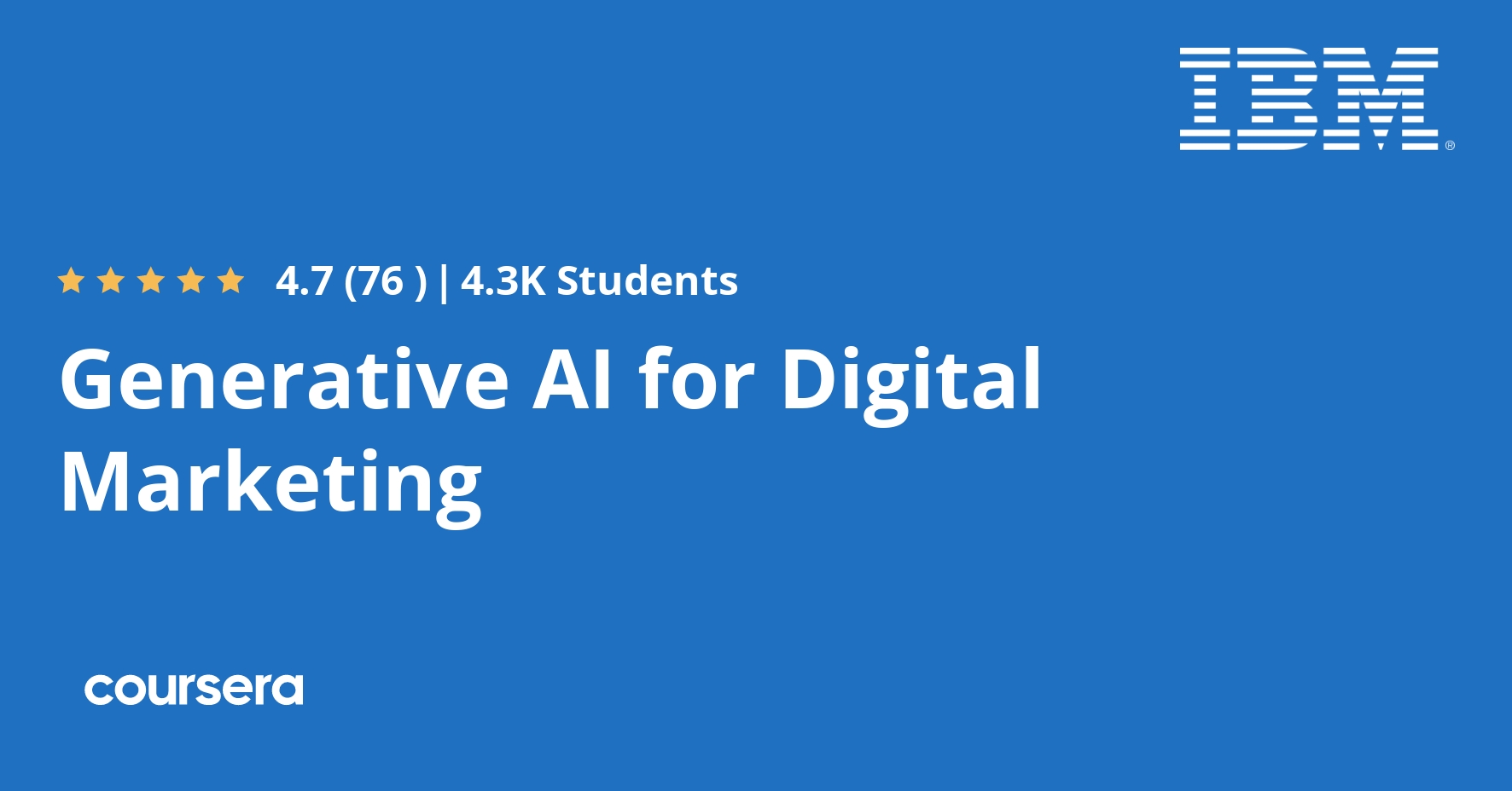 Offered by IBM. Unlock Potential of Gen AI in Digital Marketing. Learn how to leverage the capabilities & tools of genAI to create effective … Enroll for free.