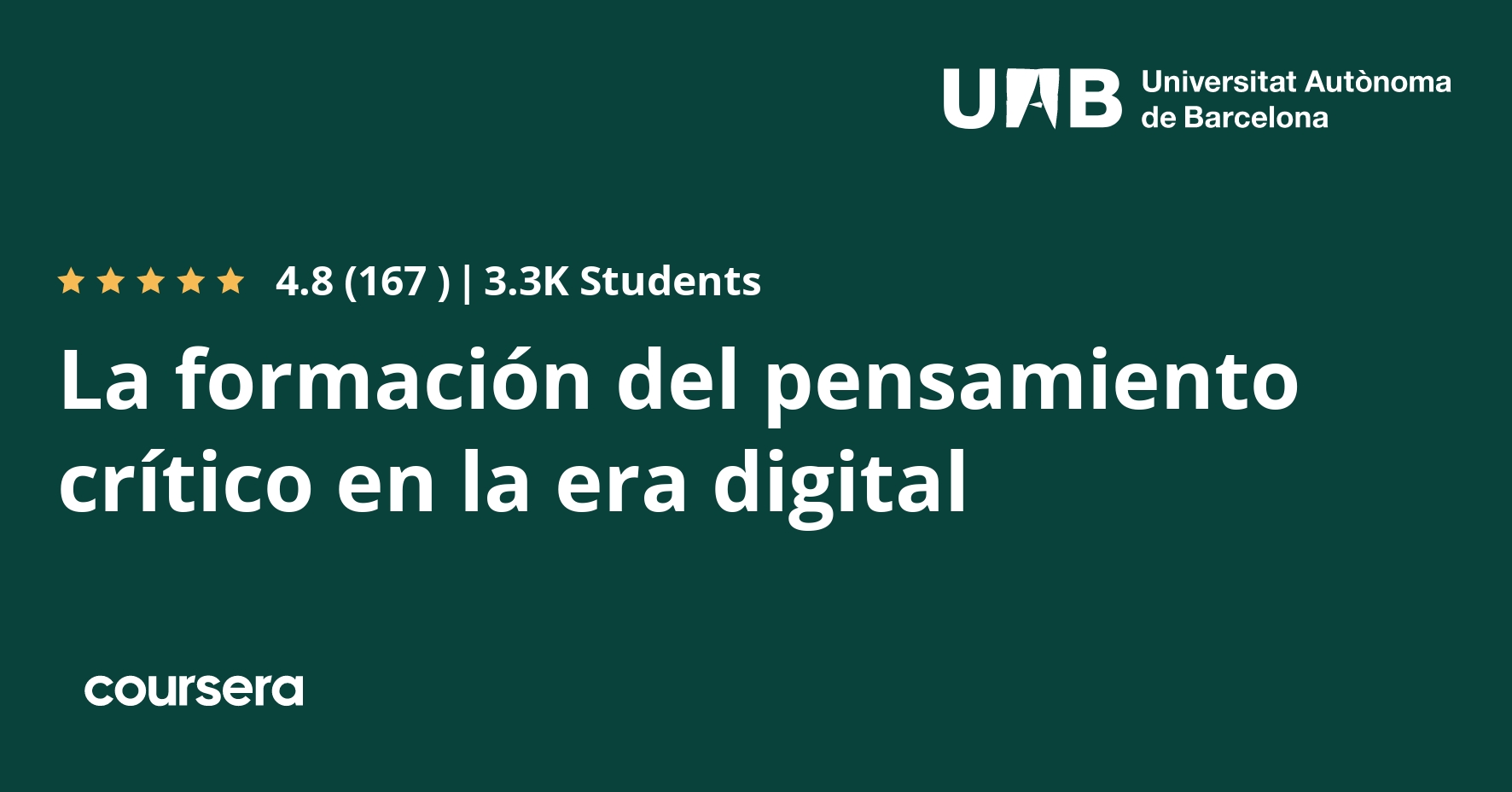 El pensamiento crítico es clave para vivir en la era digital, un mundo global e interconectado, que da acceso a gran cantidad de información que puede ser falsa, sesgada o malintencionada.Sin embargo, el desarrollo del pensamiento crítico en la educación básica y superior sigue siendo una tarea pendiente para docentes y sistemas educativos, que no han conseguido dar respuesta a las demandas de este nuevo contexto.Este curso tiene como objetivo ayudar a formar el pensamiento crítico y ofrecer recursos que permitan a los docentes desarrollarlo en sus alumnos a través de problemas sociales relevantes.La comprensión y análisis de conflictos contemporáneos globales permite proyectar pensamiento crítico y su formación hacia la participación y la justicia social, para educar una ciudadanía crítica y responsable.Después de realizar este curso serás capaz de:1. Utilizar la literacidad crítica para el desarrollo del pensamiento crítico propio y de su alumnado2. Analizar el contexto social mundial para la formación de una ciudadanía global3. Humanizar la enseñanza de las ciencias sociales para un tratamiento crítico de los contenidos4. Contrarrestar los relatos del odio contra minorías y colectivos oprimidos en la era digital 5. Enseñar y aprender a partir de problemas sociales relevantes globales para la participación y la justicia social.